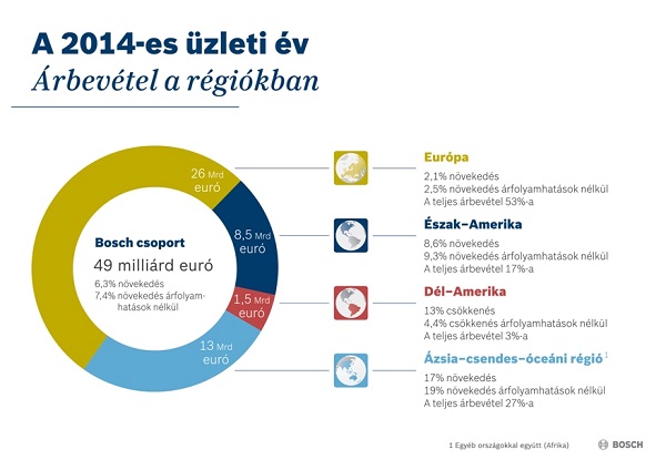 2014-ben a termékinnovációk ismét javították a Bosch piaci pozícióit: az elmúlt üzleti év során a vállalat árbevétele 6,3 százalékkal nőtt, így elérte a 49 milliárd eurót, miközben árfolyamhatások nélkül a növekedés 7,4 százalékos volt. A mintegy 500 millió eurót kitevő negatív árfolyamhatások miatt az átmenetileg erős euró kedvezőtlenül befolyásolta az árbevételt. Az erős forgalomnövekedés is hozzájárult a jobb eredményhez: a kamatfizetés és adózás előtti eredmény (EBIT) tavaly 3 milliárd euróra nőtt, ami körülbelül 10 százalékos éves növekedést jelent. Ennek megfelelően a Bosch 6,2 százalékos nyereségről számolt be 2014-ben. Az egyszeri és rendkívüli hatások miatti kiigazítás után ez hozzávetőlegesen egy százalékponttal jobb a 2013-as értéknél. „A jelentős eredményjavulásban szerepet játszott a költségoptimalizálás terén végzett kemény munkánk: a csupán szerény globális gazdasági növekedés ellenére is sikeresek voltunk 2014-ben” – jelentette ki Dr. Stefan Asenkerschbaumer, a Bosch pénzügyi igazgatója és igazgatótanácsának elnökhelyettese. A BSH Bosch und Siemens Hausgeräte GmbH teljes átvételével (jelenleg BSH Hausgeräte GmbH) a Bosch megerősítette pozícióját az intelligens otthonok piacán, a ZF Lenksysteme GmbH felvásárlása (jelenleg Robert Bosch Automotive Steering GmbH) nyomán pedig a Bosch a növekedési területnek számító automatizált vezetési rendszerek termékportfolióját egészítette ki.
